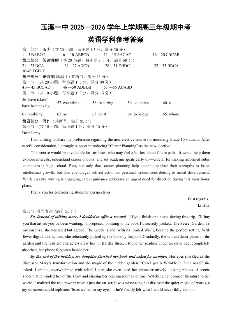 云南省玉溪第一中学2025-2026学年高三上学期期中考试 英语答案.doc