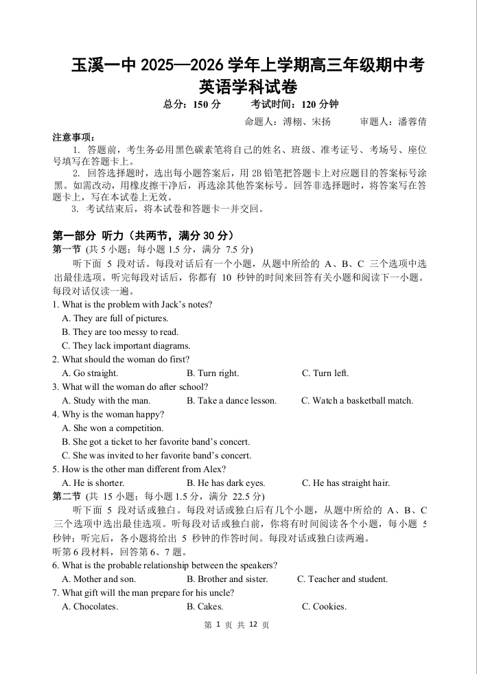 云南省玉溪第一中学2025-2026学年高三上学期期中考试 英语.docx