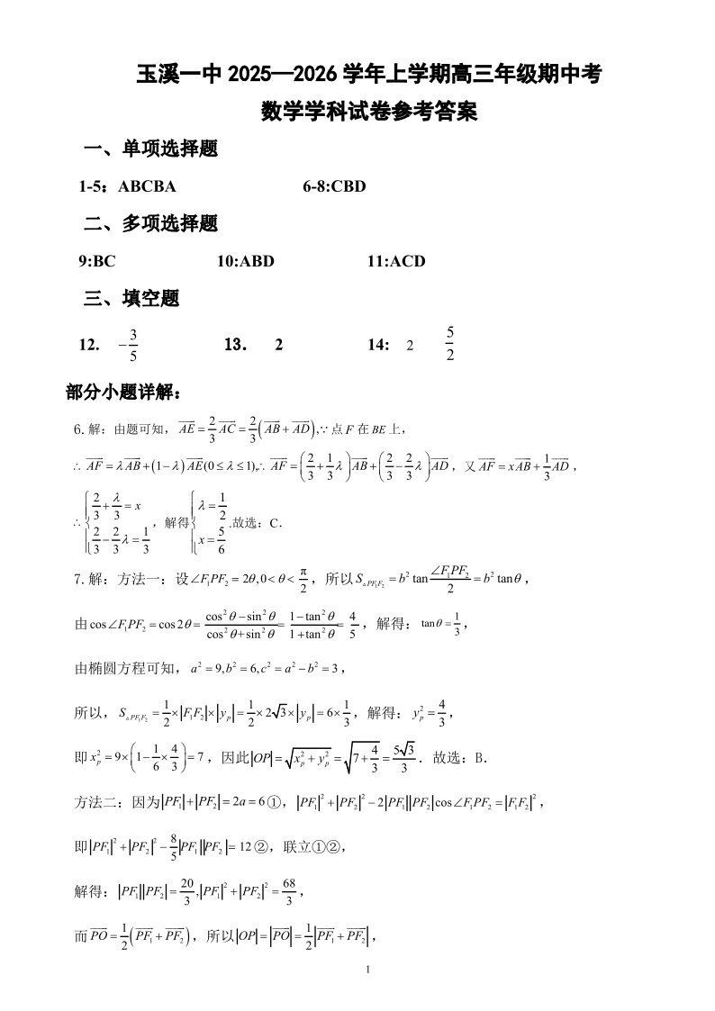 云南省玉溪第一中学2025-2026学年高三上学期期中考试 数学答案.pdf