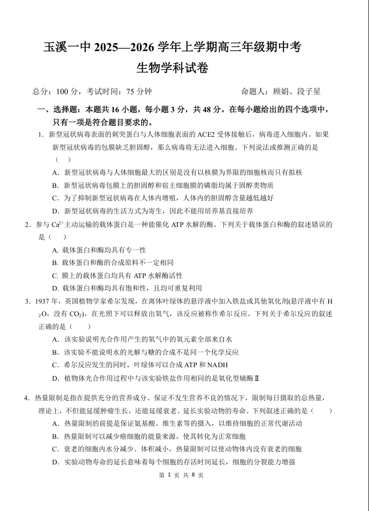 云南省玉溪第一中学2025-2026学年高三上学期期中考试 生物.docx