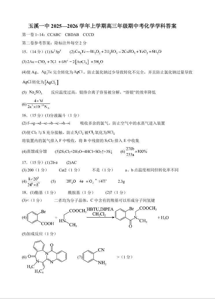 云南省玉溪第一中学2025-2026学年高三上学期期中考试 化学答案.docx
