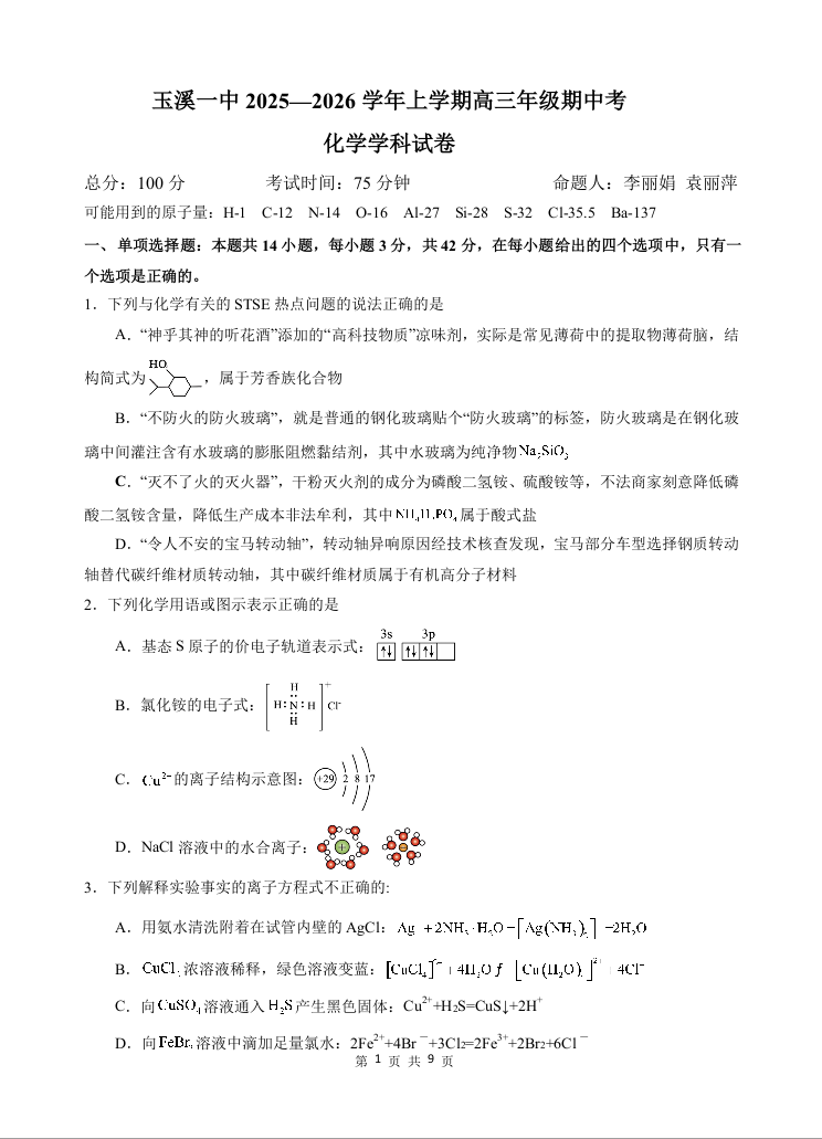 云南省玉溪第一中学2025-2026学年高三上学期期中考试 化学.docx