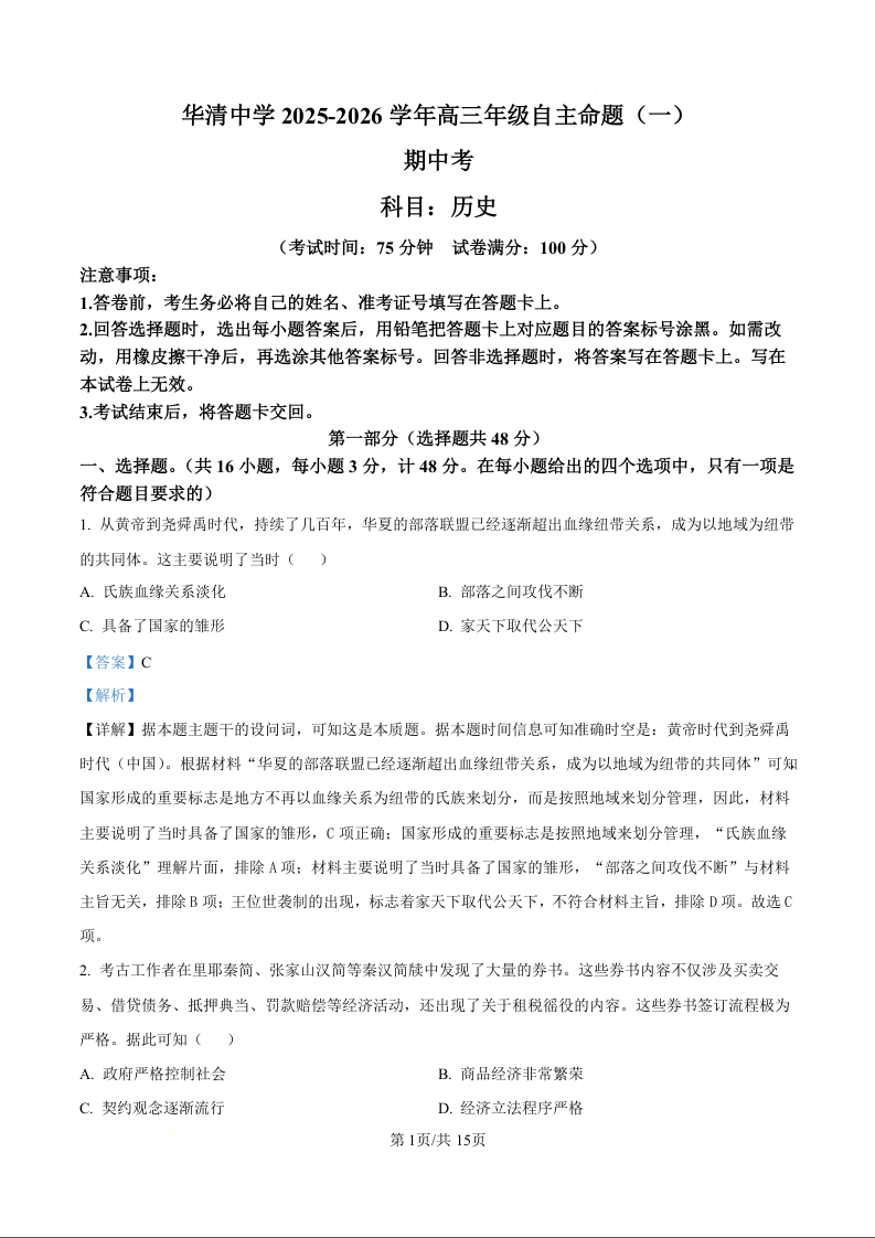 陕西省西安市华清中学2026届高三上学期11月期中考试 历史答案.docx