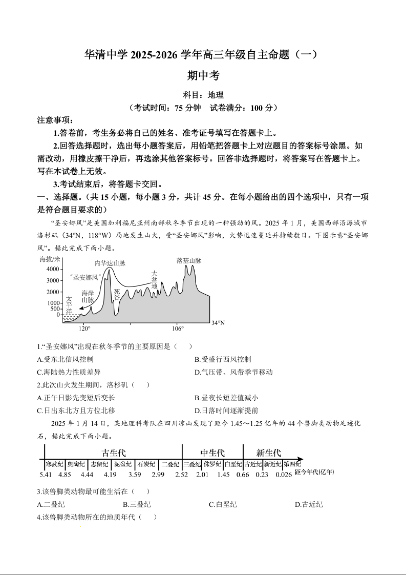 陕西省西安市华清中学2026届高三上学期11月期中考试 地理试题(含答案).docx