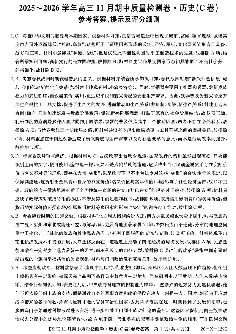 山西省卓越联盟2025-2026学年高三11月期中质量检测卷 历史答案.pdf