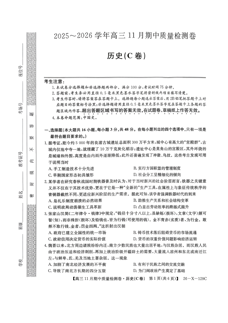 山西省卓越联盟2025-2026学年高三11月期中质量检测卷 历史.pdf
