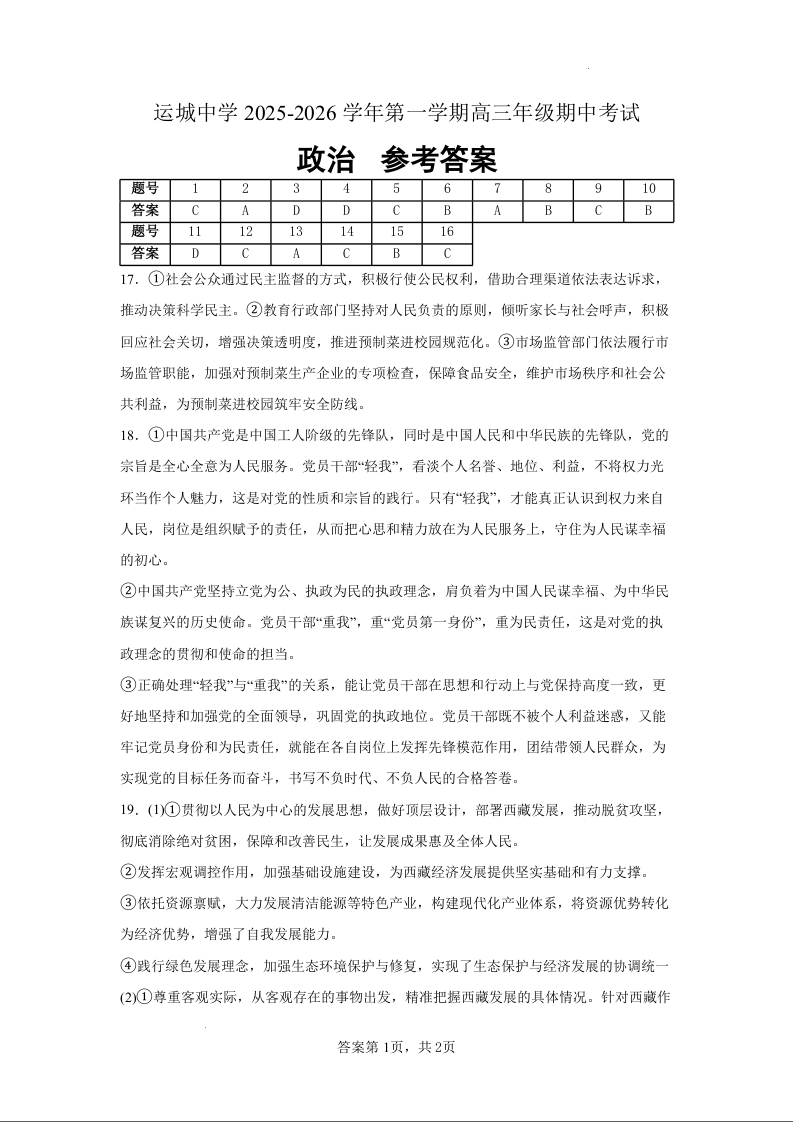山西省运城中学2026届高三上学期11月期中考试 政治答案.docx