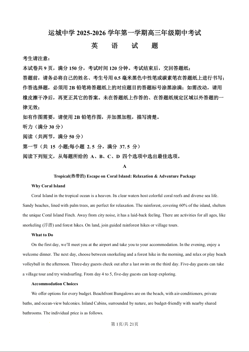 山西省运城中学2026届高三上学期11月期中考试 英语答案.docx