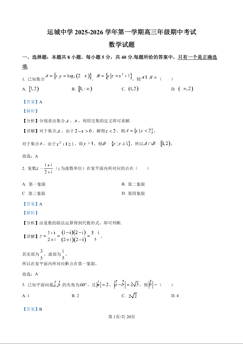 山西省运城中学2026届高三上学期11月期中考试 数学答案.docx