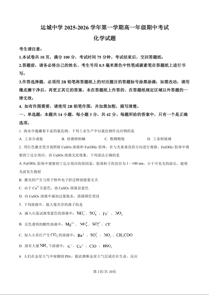 山西省运城中学2026届高三上学期11月期中考试 化学.docx
