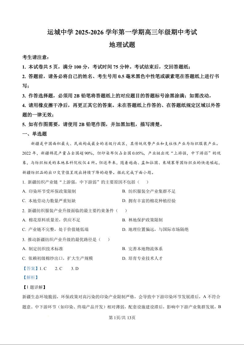 山西省运城中学2026届高三上学期11月期中考试 地理答案.docx