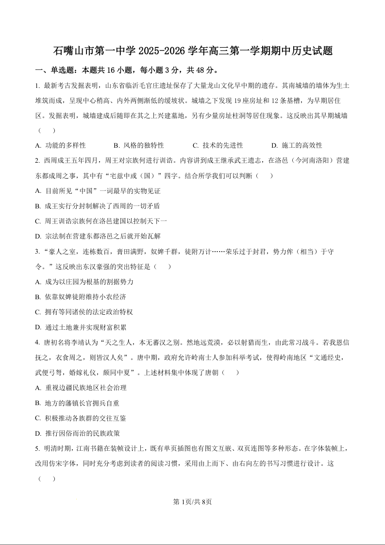 宁夏石嘴山市第一中学2026届高三上学期11月期中考试 历史.docx