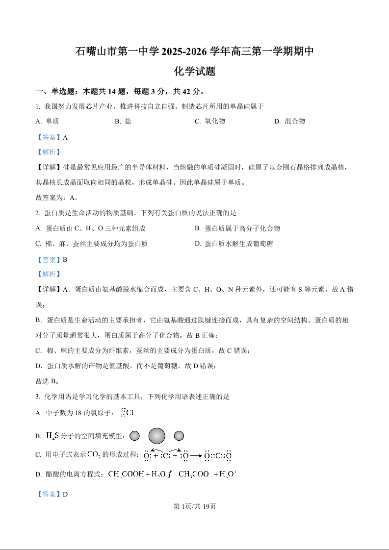 宁夏石嘴山市第一中学2026届高三上学期11月期中考试 化学答案.docx