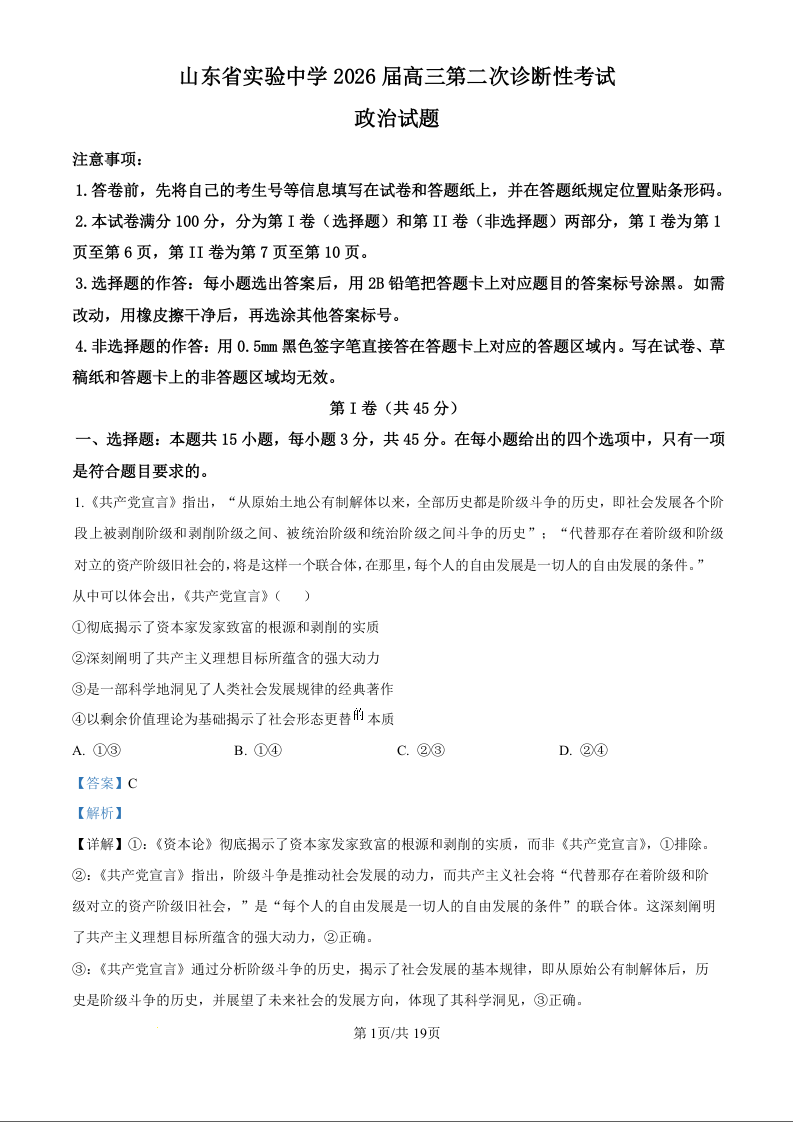 山东省实验中学2026届高三第二次诊断性考试 政治答案.docx