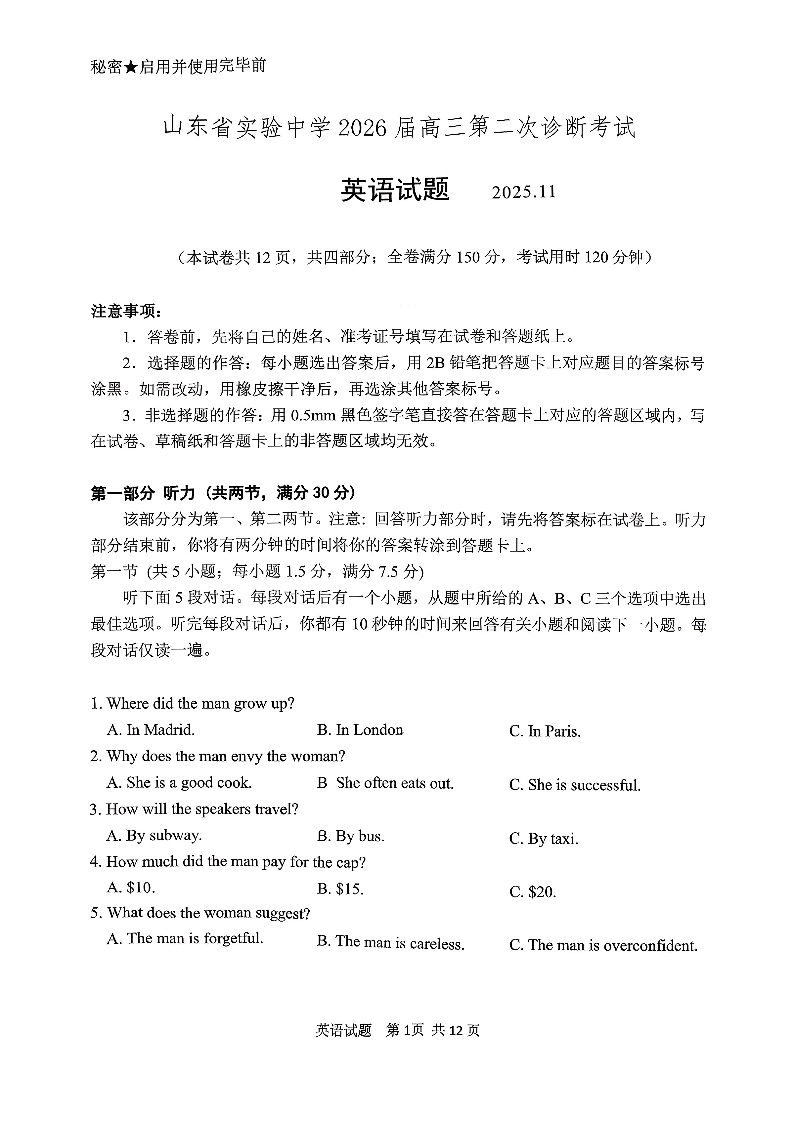 山东省实验中学2026届高三第二次诊断性考试 英语.pdf