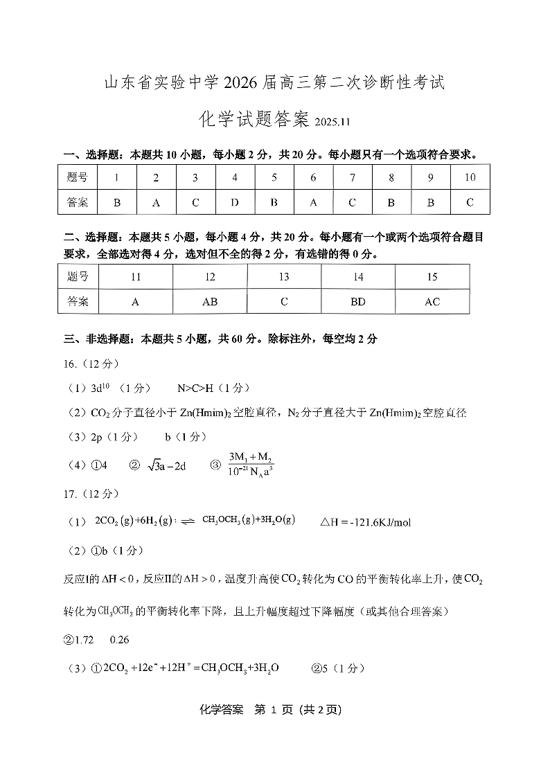 山东省实验中学2026届高三第二次诊断性考试 化学答案.pdf