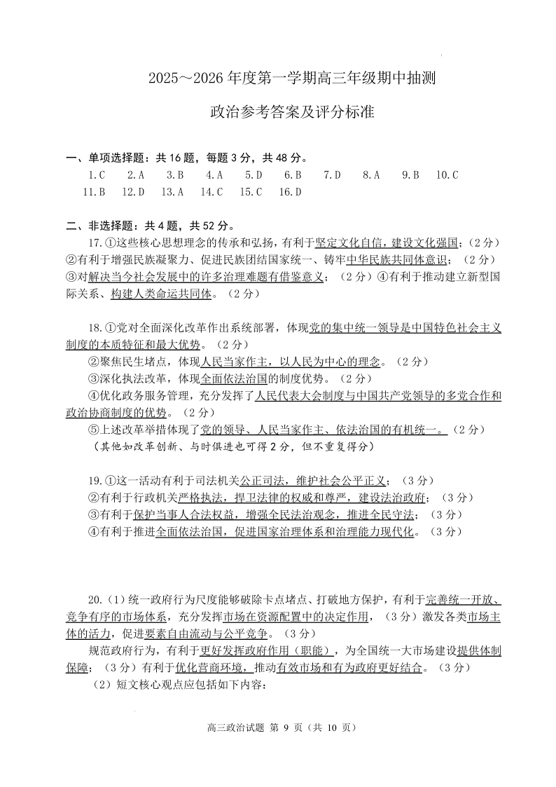 徐州市2025~2026学年度第一学期高三年级期中抽测 政治答案.pdf