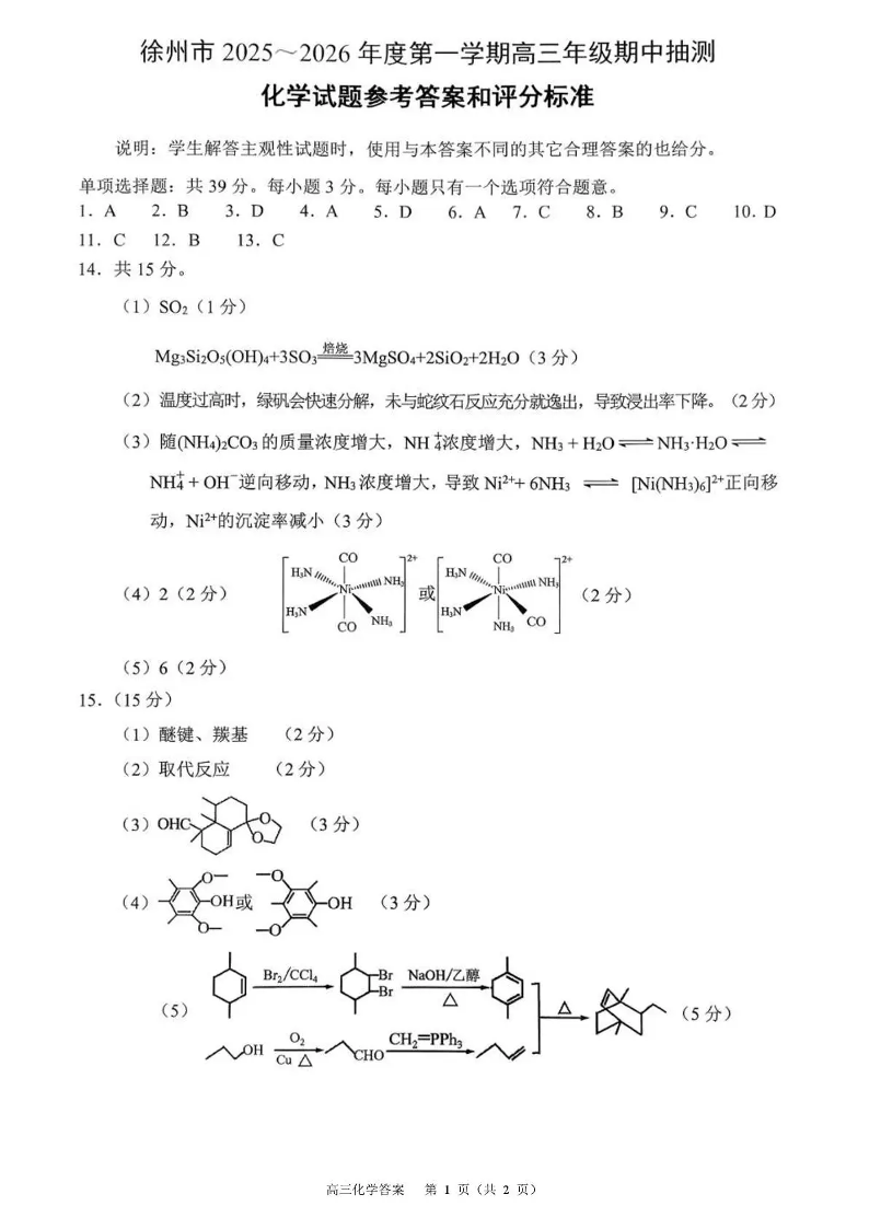 徐州市2025~2026学年度第一学期高三年级期中抽测 化学答案.pdf