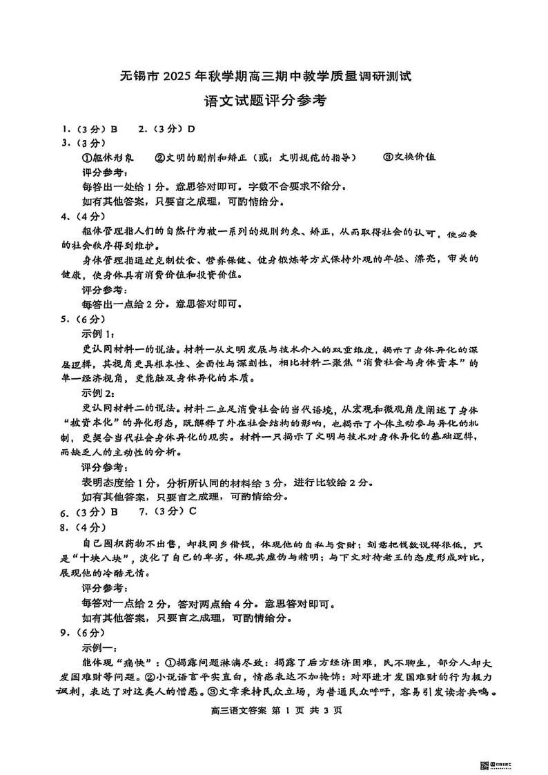 无锡市2025年秋学期高三期中教学质量调研测试 语文答案.pdf