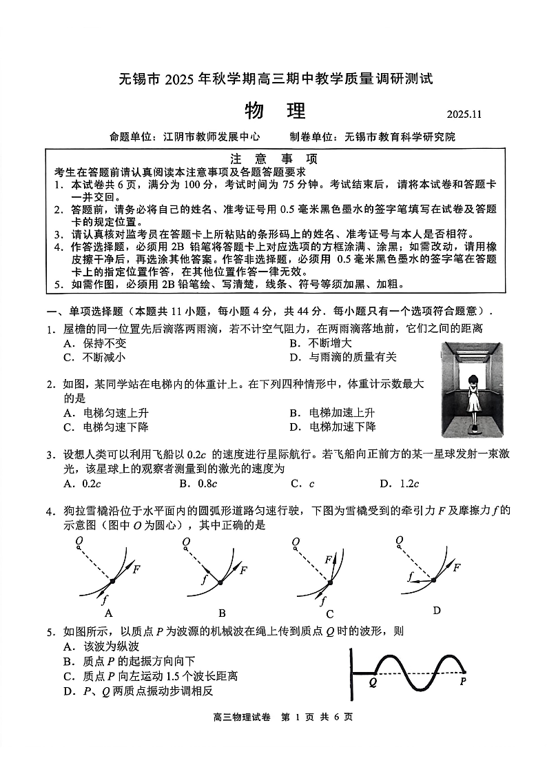 无锡市2025年秋学期高三期中教学质量调研测试 物理.pdf