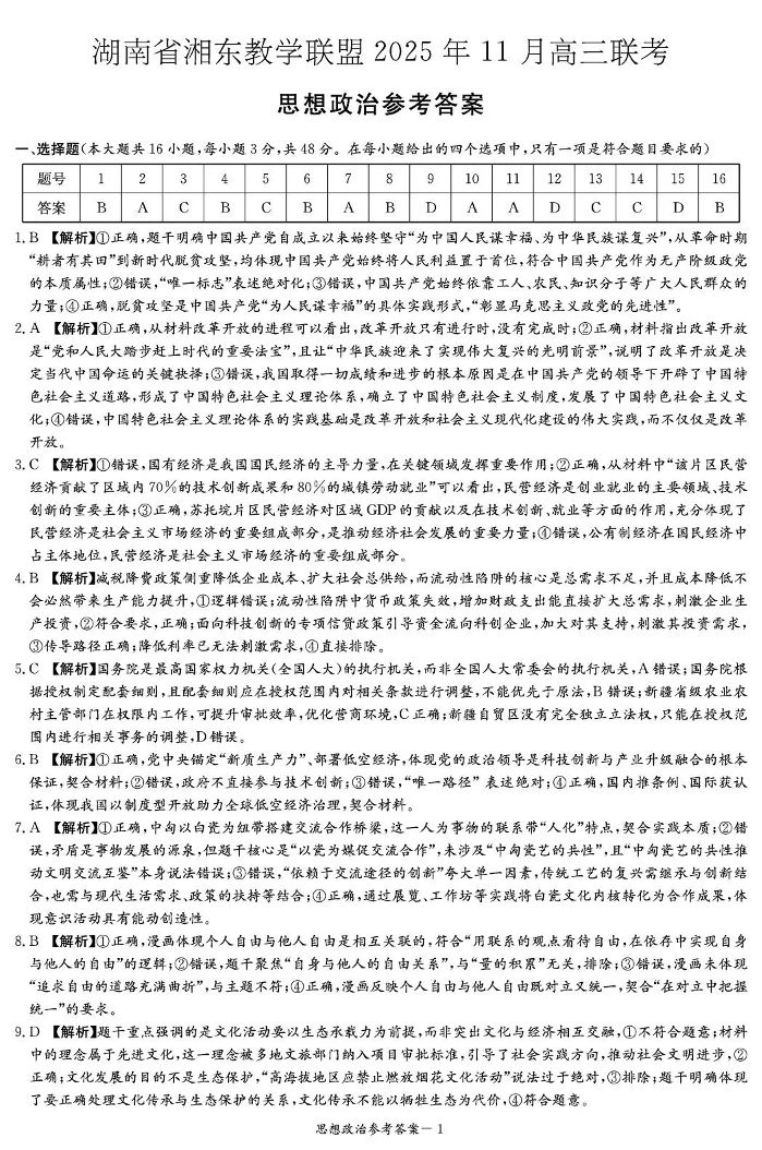 湖南省湘东教学联盟2025年11月高三联考 政治答案.pdf