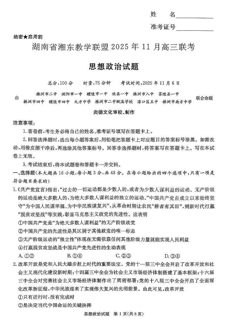 湖南省湘东教学联盟2025年11月高三联考 政治.pdf