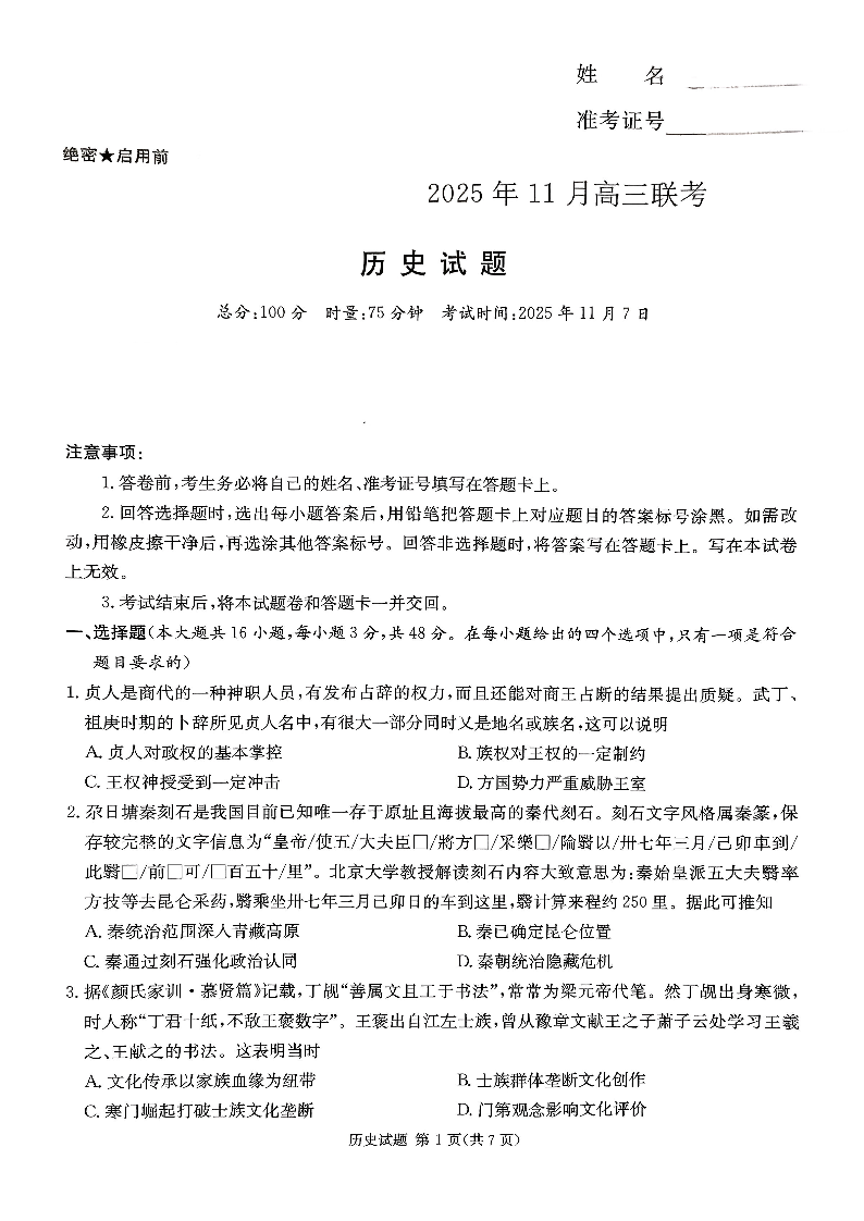 湖南省湘东教学联盟2025年11月高三联考 历史.pdf