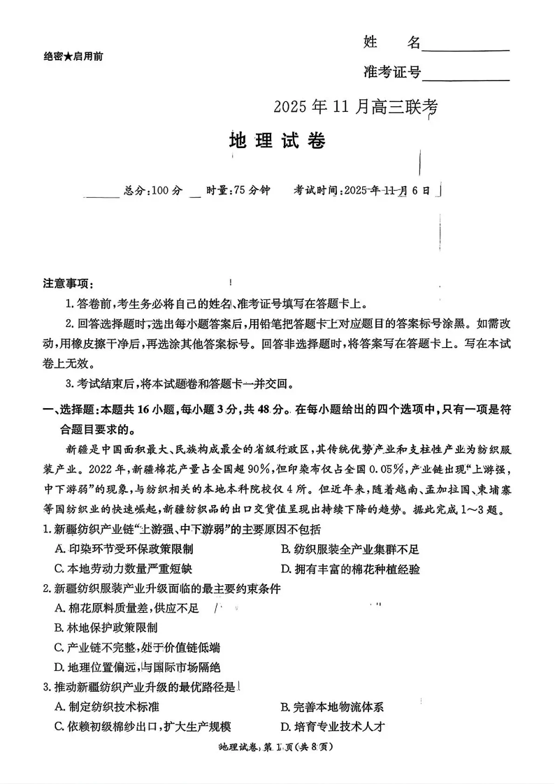 湖南省湘东教学联盟2025年11月高三联考 地理.pdf