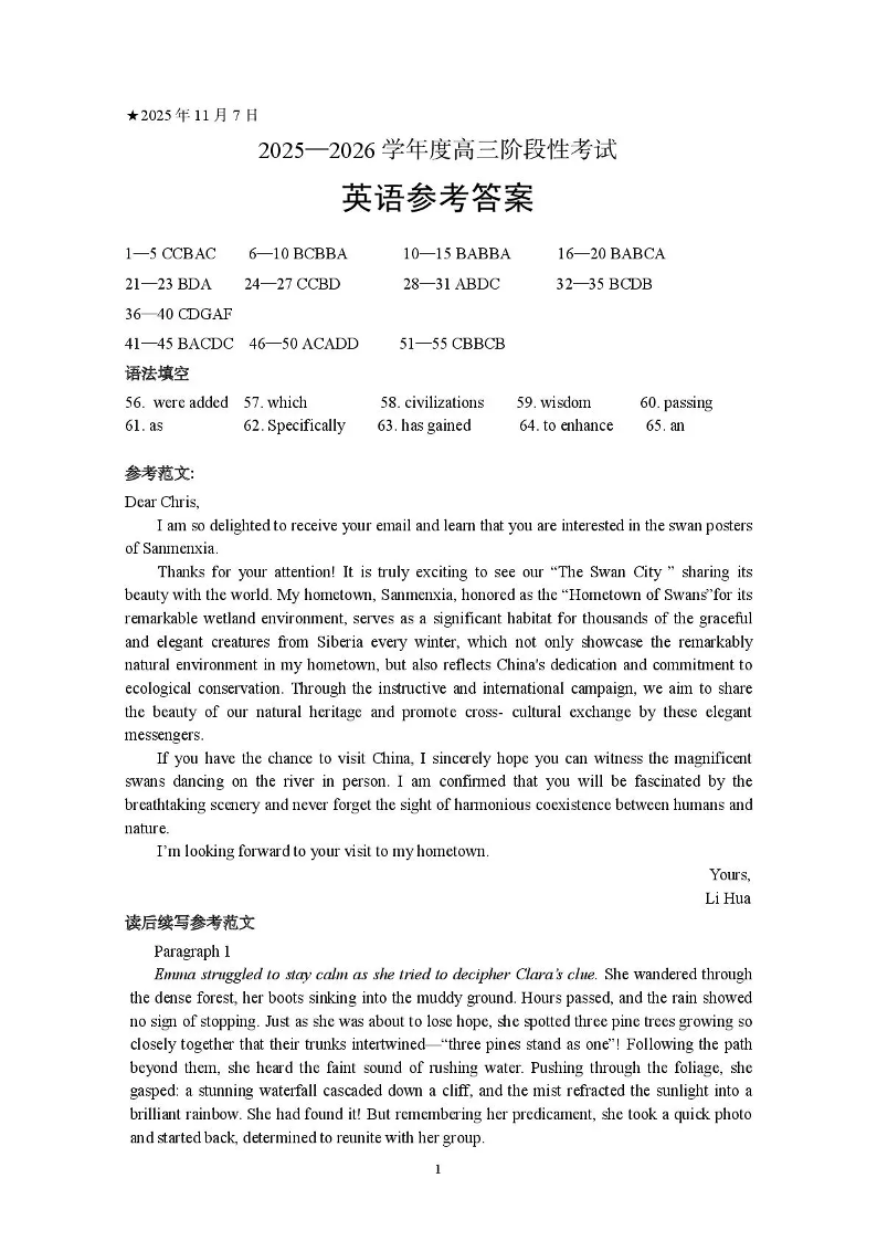 三门峡市2025—2026学年度高三阶段性考试 英语答案.pdf