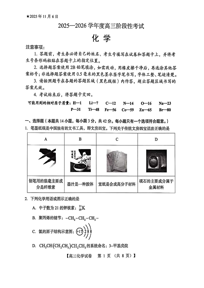 三门峡市2025—2026学年度高三阶段性考试 化学.pdf