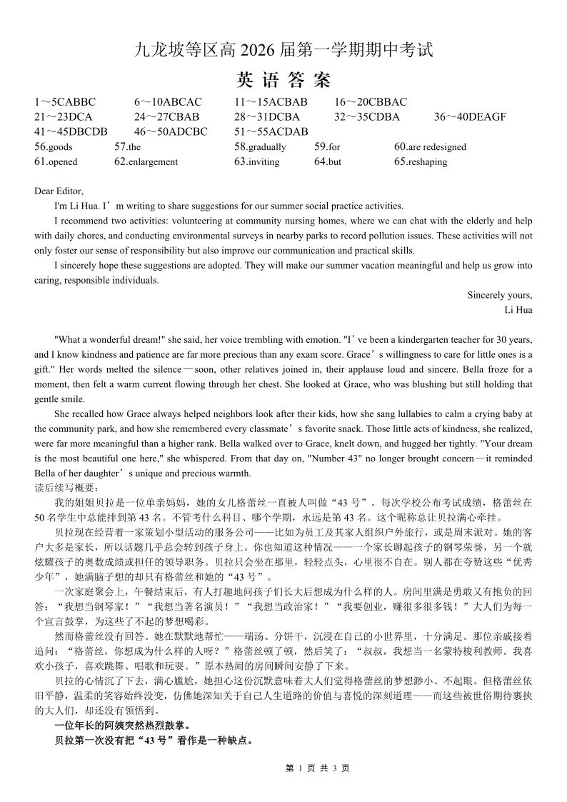 九龙坡等区高2026届高三第一学期期中考试 英语答案.pdf