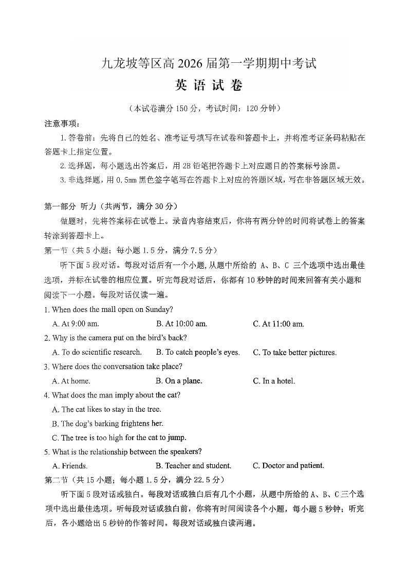 九龙坡等区高2026届高三第一学期期中考试 英语.pdf