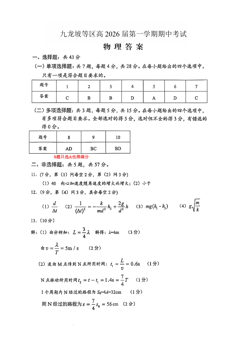 九龙坡等区高2026届高三第一学期期中考试 物理答案.pdf