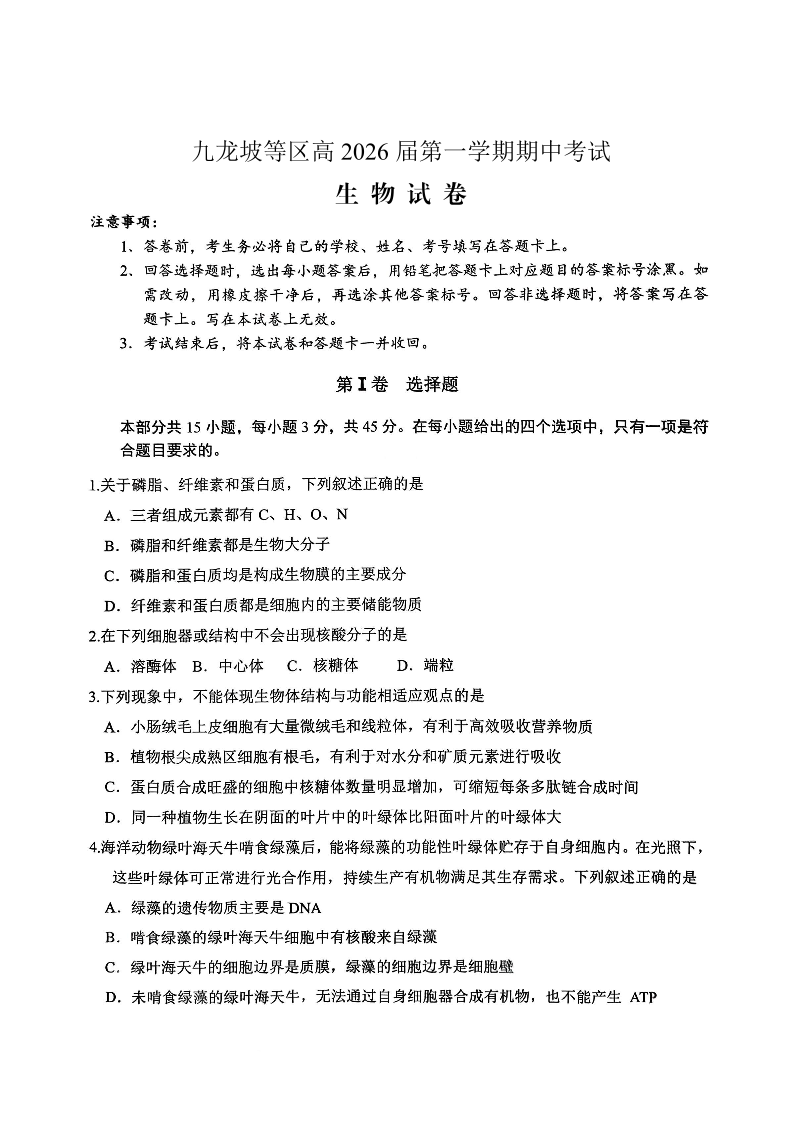 九龙坡等区高2026届高三第一学期期中考试 生物.pdf
