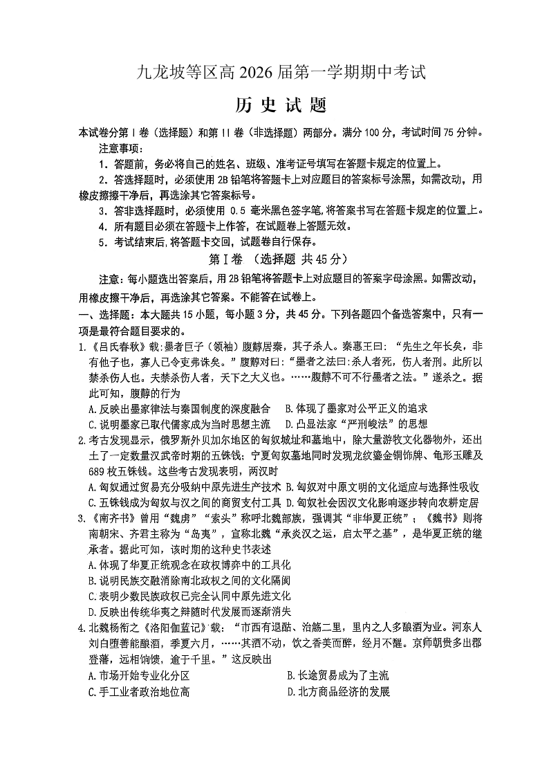 九龙坡等区高2026届高三第一学期期中考试 历史.pdf