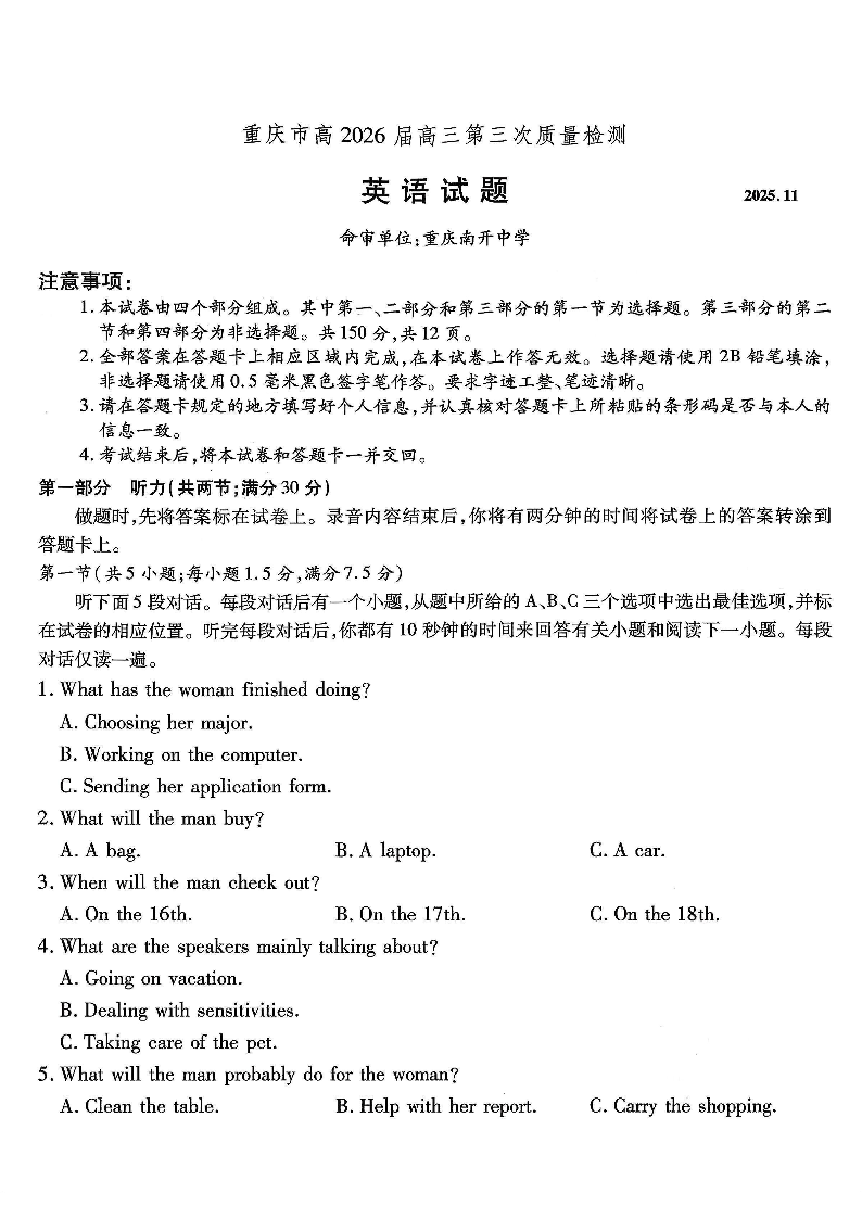南开中学高2026届高三第三次质量检测 英语.pdf
