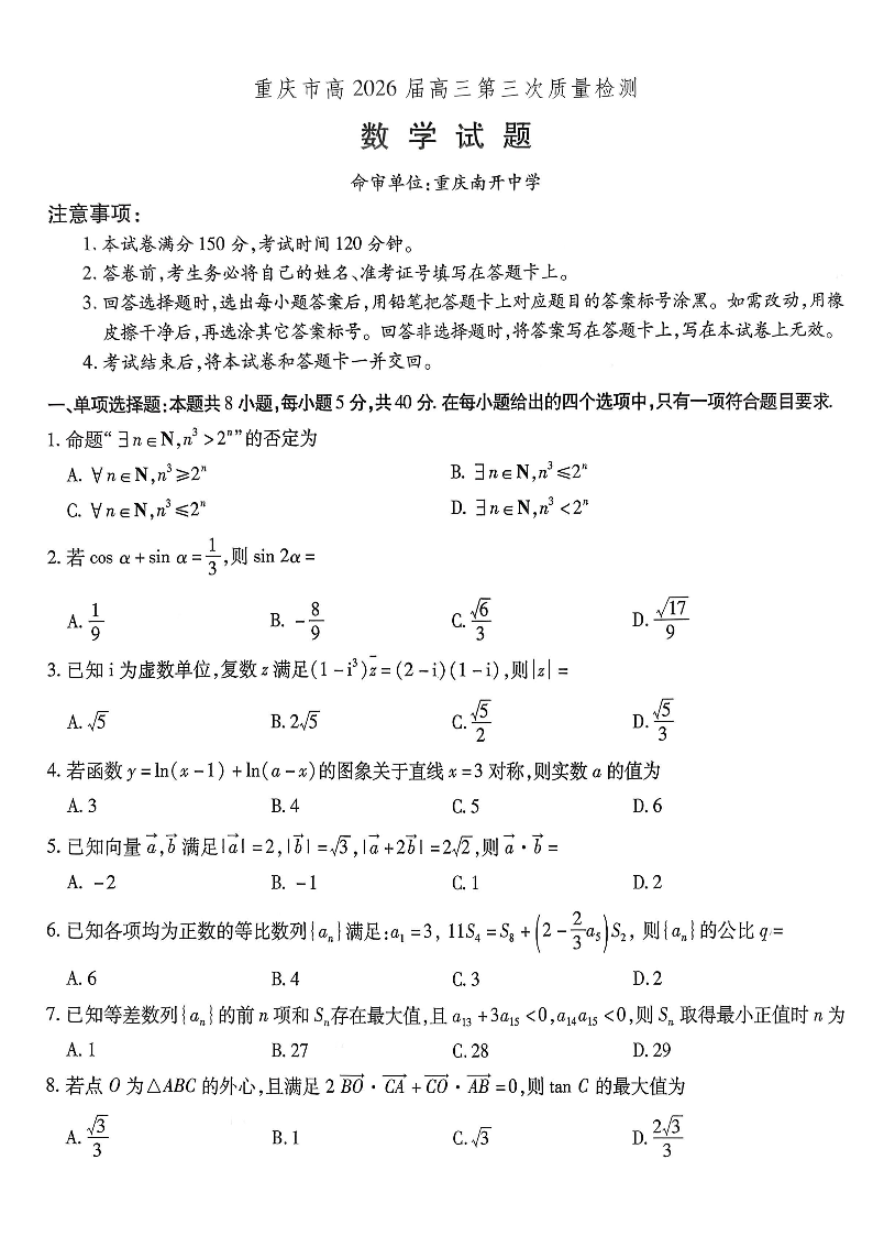南开中学高2026届高三第三次质量检测 数学.pdf