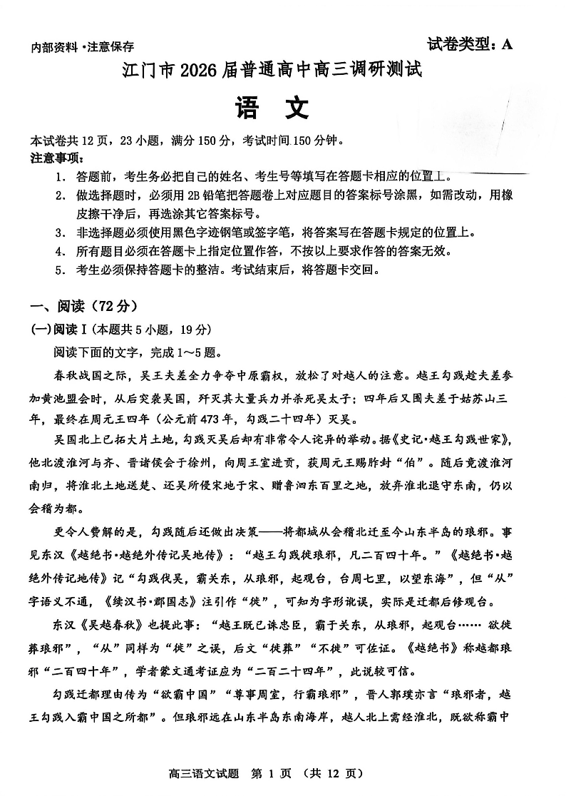 广东省江门市2026届普通高中高三调研测试 语文.pdf