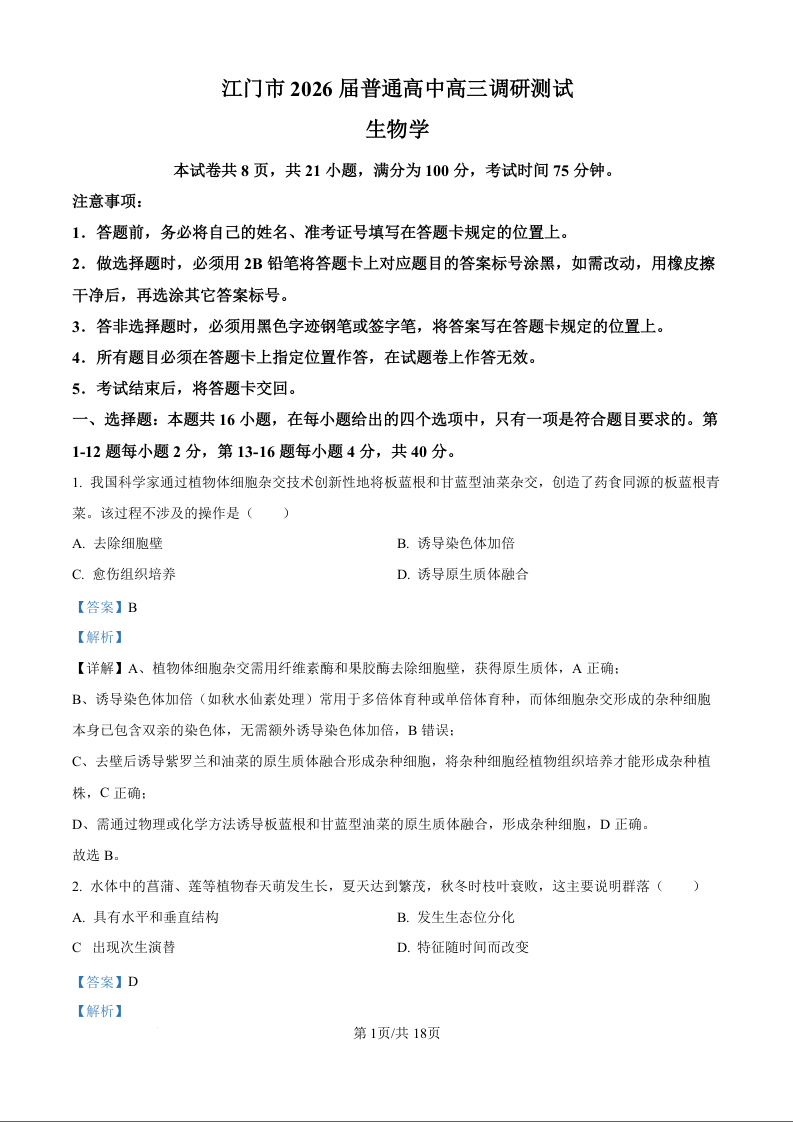 广东省江门市2026届普通高中高三调研测试 生物答案.docx