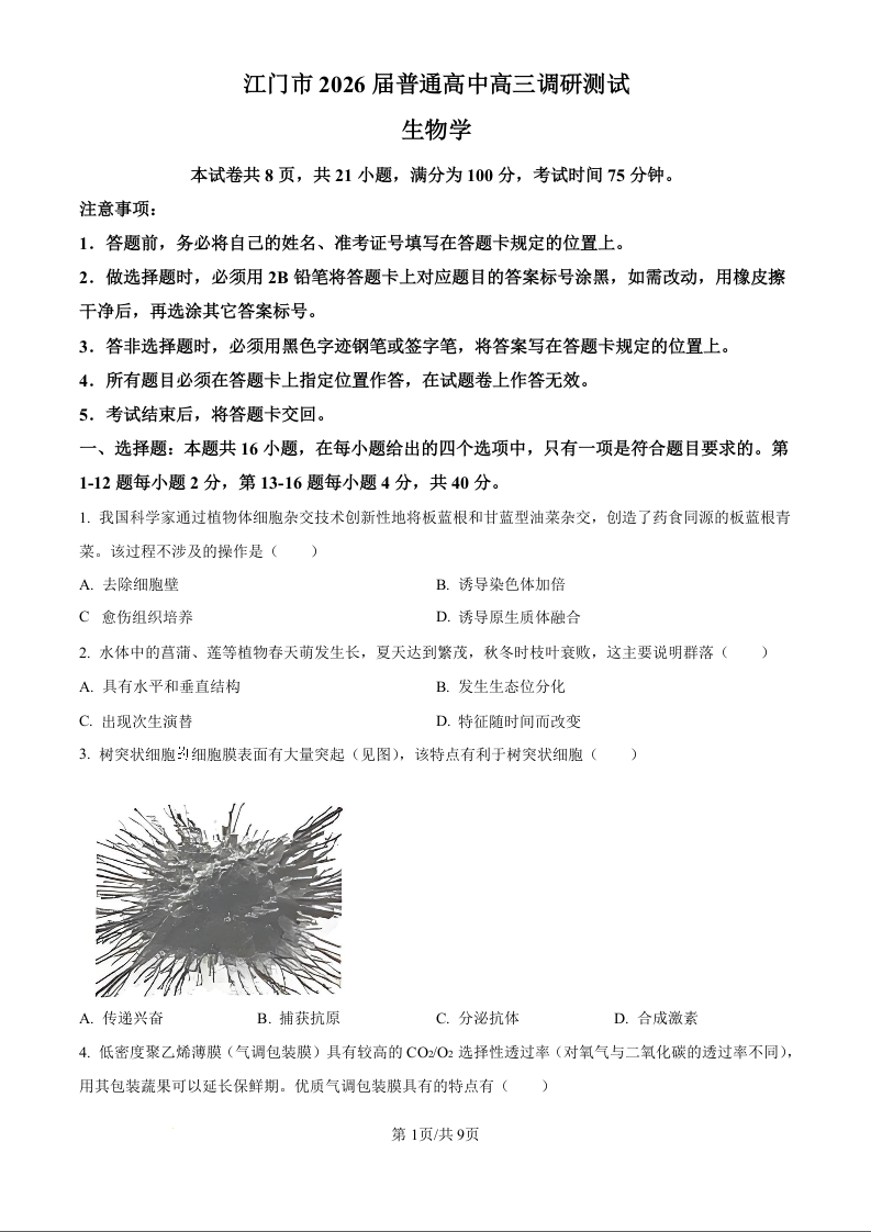 广东省江门市2026届普通高中高三调研测试 生物.docx