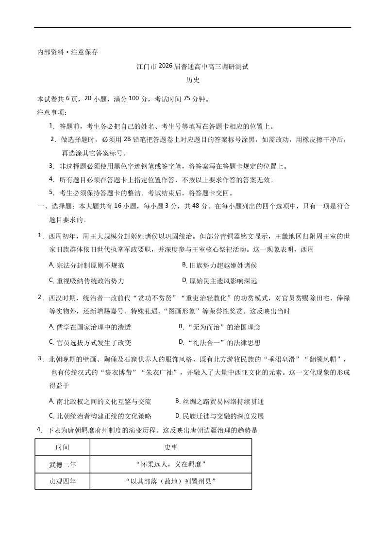 广东省江门市2026届普通高中高三调研测试 历史.docx