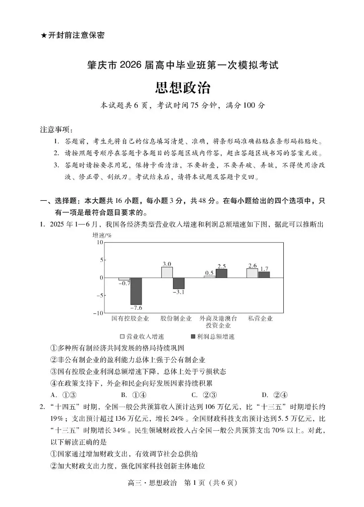 肇庆市2026届高中毕业班第一次模拟考试 政治.pdf