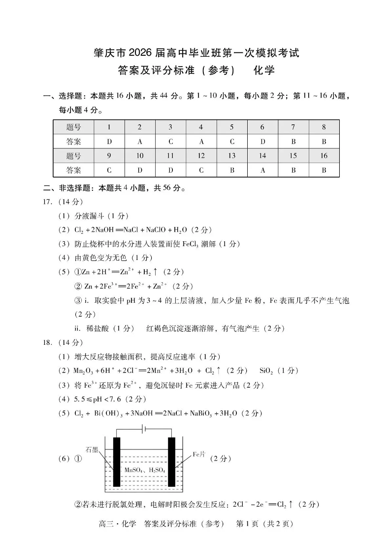 肇庆市2026届高中毕业班第一次模拟考试 化学答案.pdf
