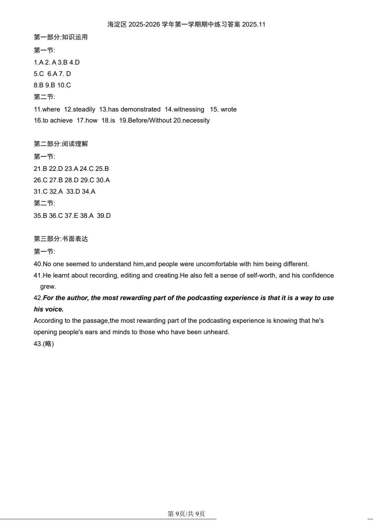 海淀区2025一2026学年第一学期期中练习 英语答案.pdf