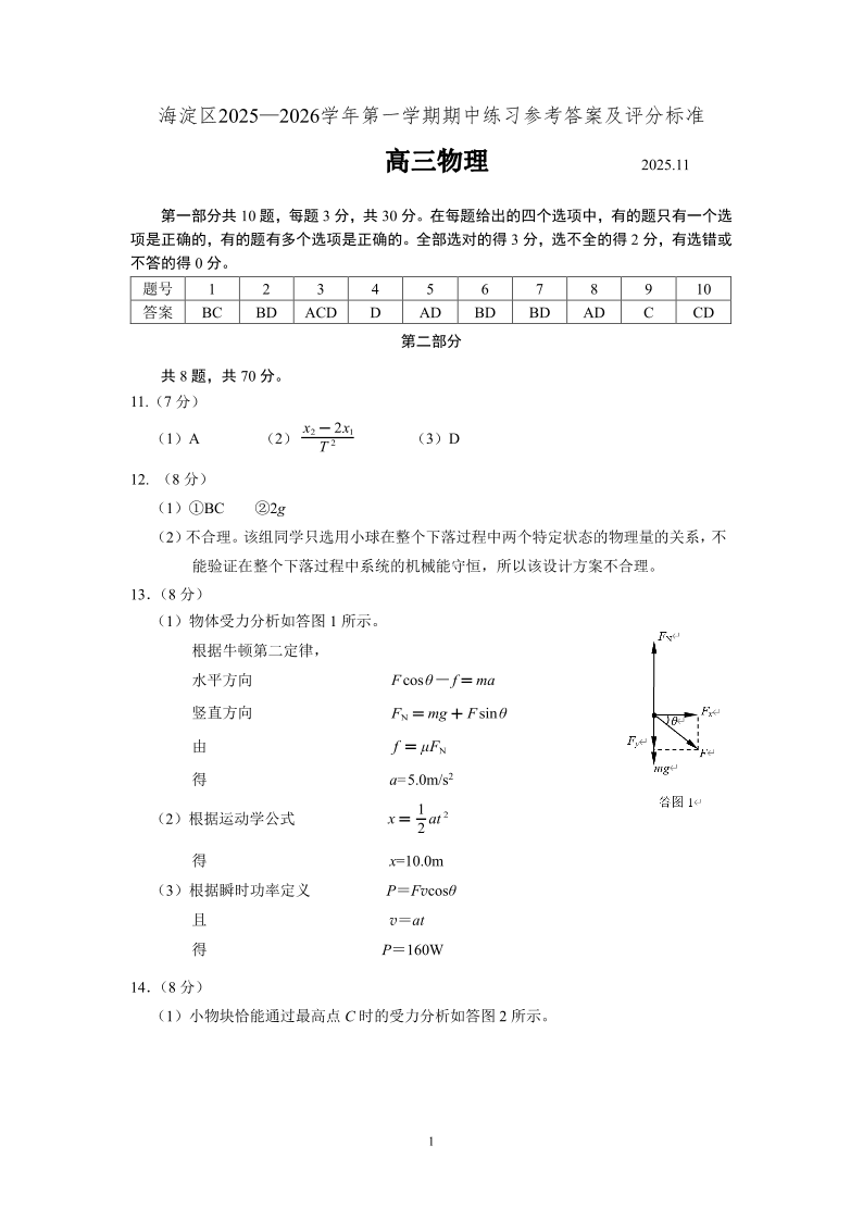 海淀区2025一2026学年第一学期期中练习 物理答案.pdf