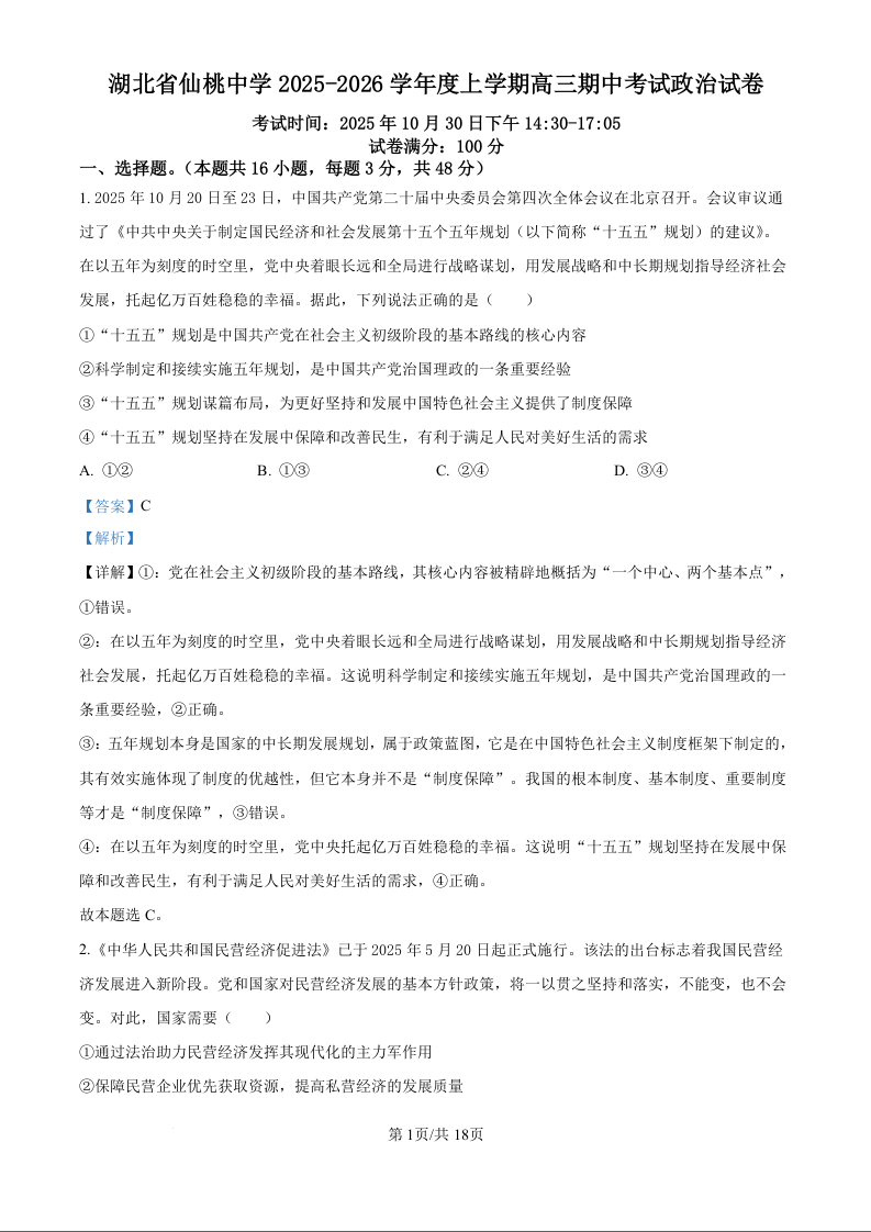 湖北省仙桃中学2025-2026学年高三上学期期中考试 政治答案.docx