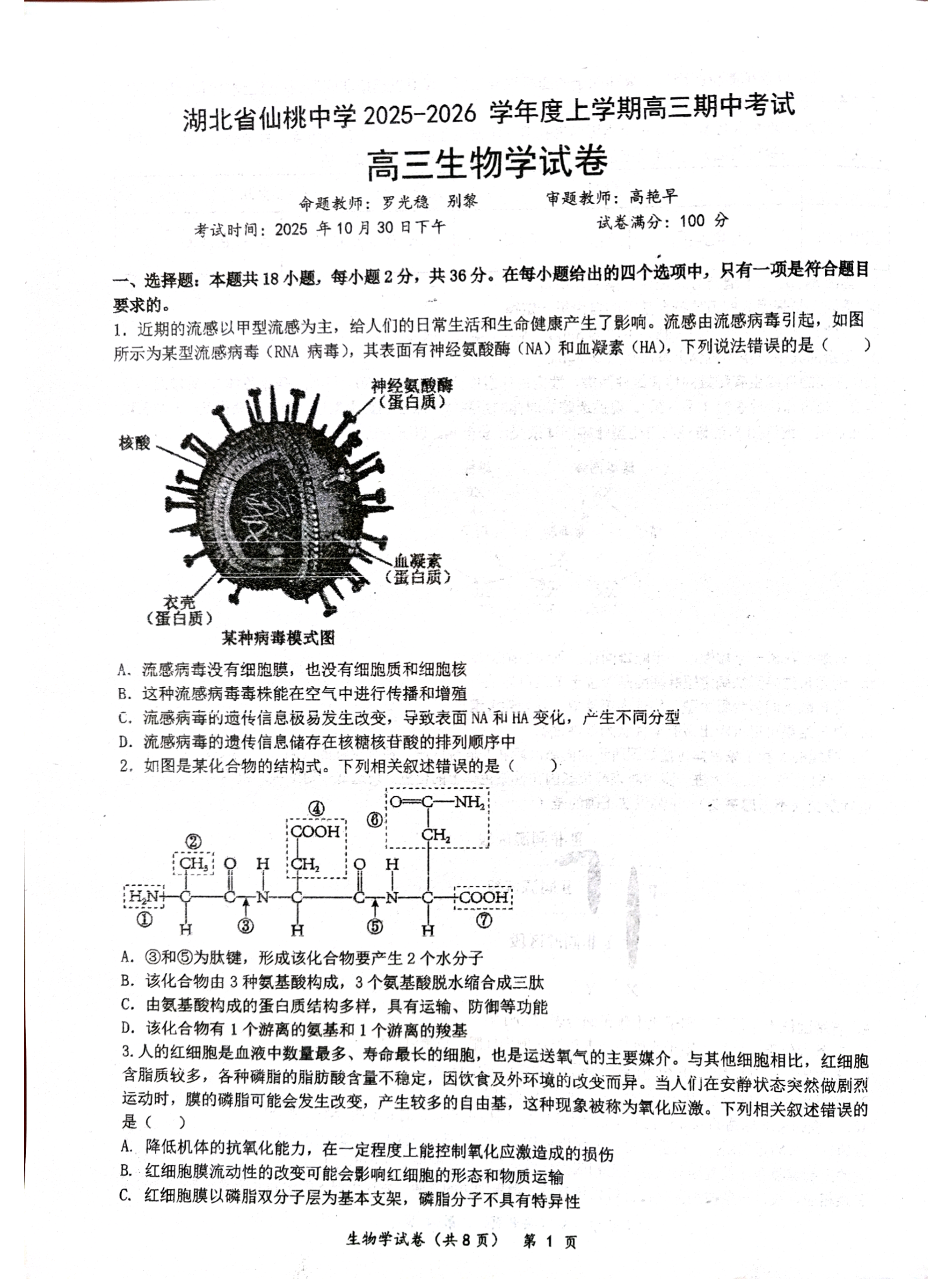 湖北省仙桃中学2025-2026学年高三上学期期中考试 生物试题(含答案).pdf