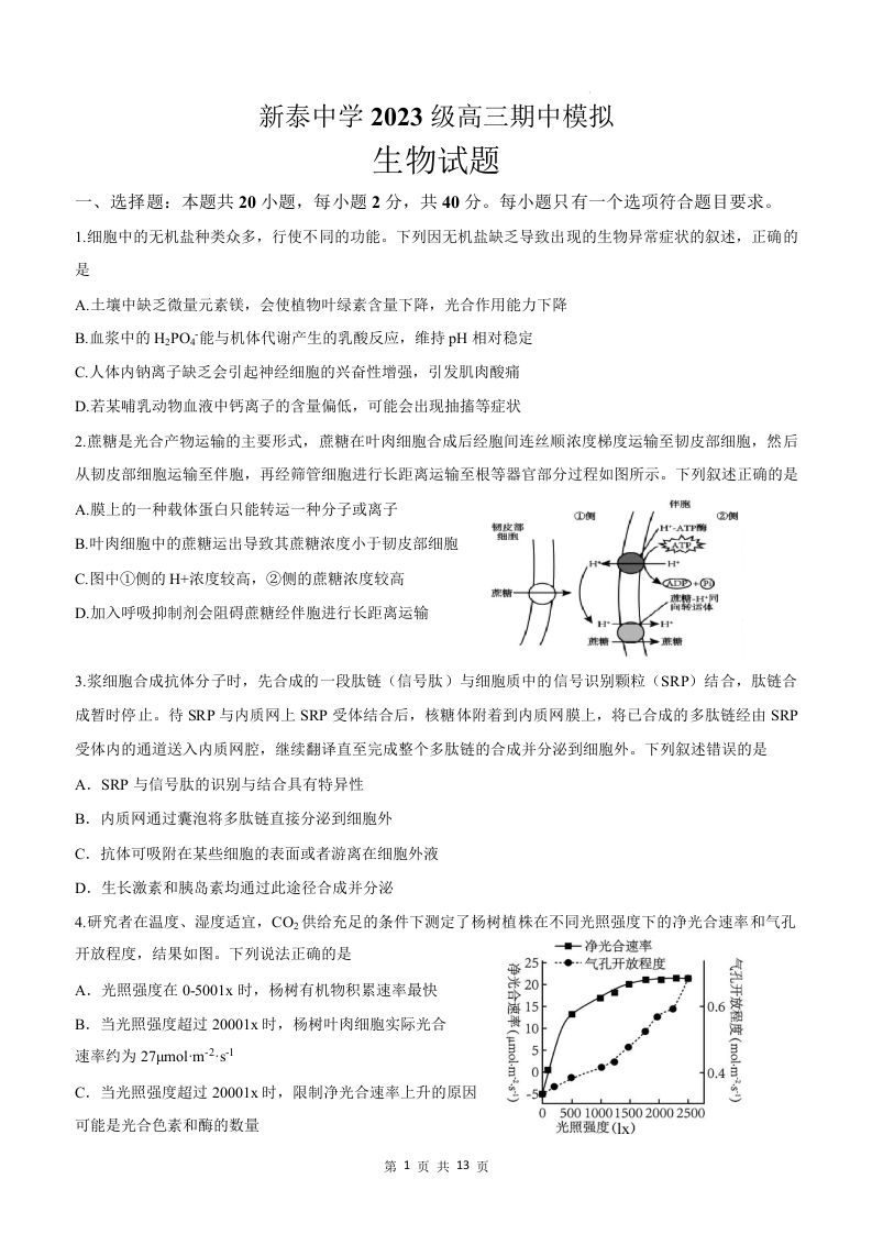 山东省泰安市新泰中学2025-2026学年高三上学期期中模拟 生物.docx