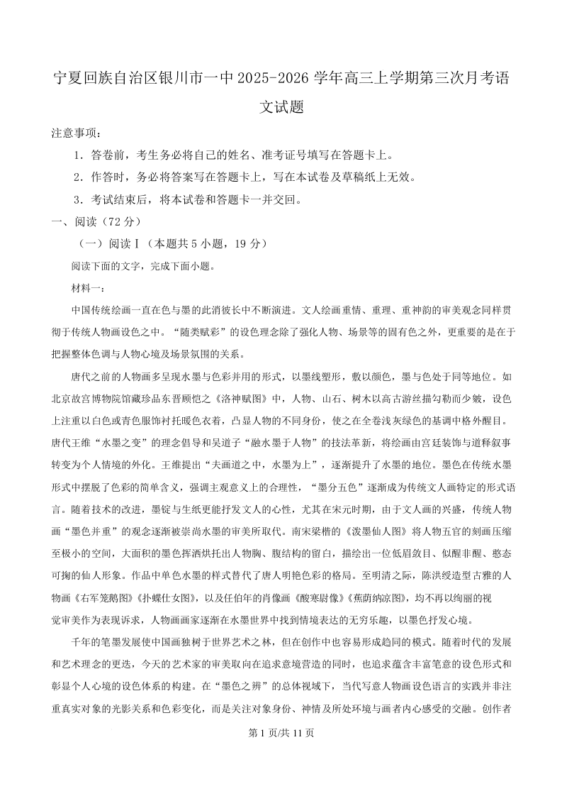 宁夏银川市一中2026届高三上学期第三次月考 语文.docx