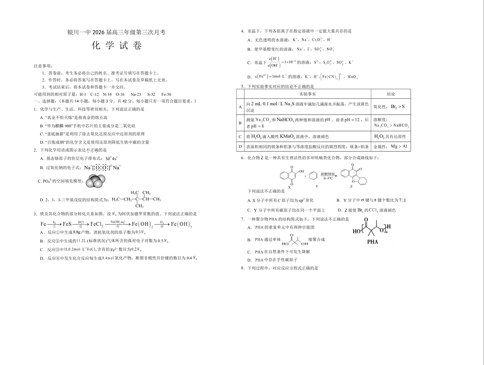 宁夏银川市一中2026届高三上学期第三次月考 化学.docx